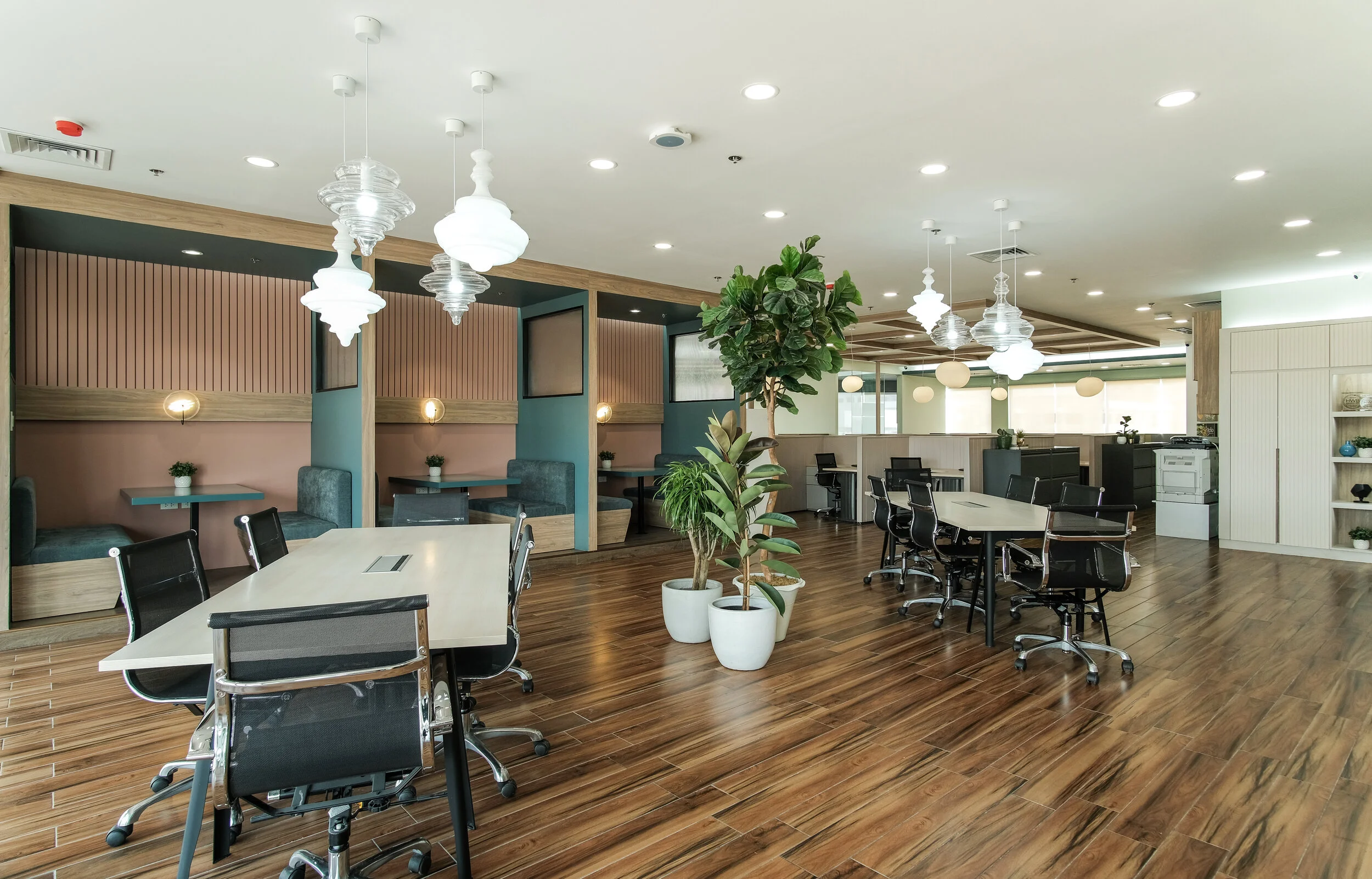 Our favorite feature in the office area is the booth seating. We did color blocking for this as well with pinks and blues. For the overall area, most of the colors used were in the muted spectrum and neutrals mixed with wood accents to give a more refreshing, light and airy vibe. We also loved the huge tree plant in the middle of our accent Moroccan like lamps.