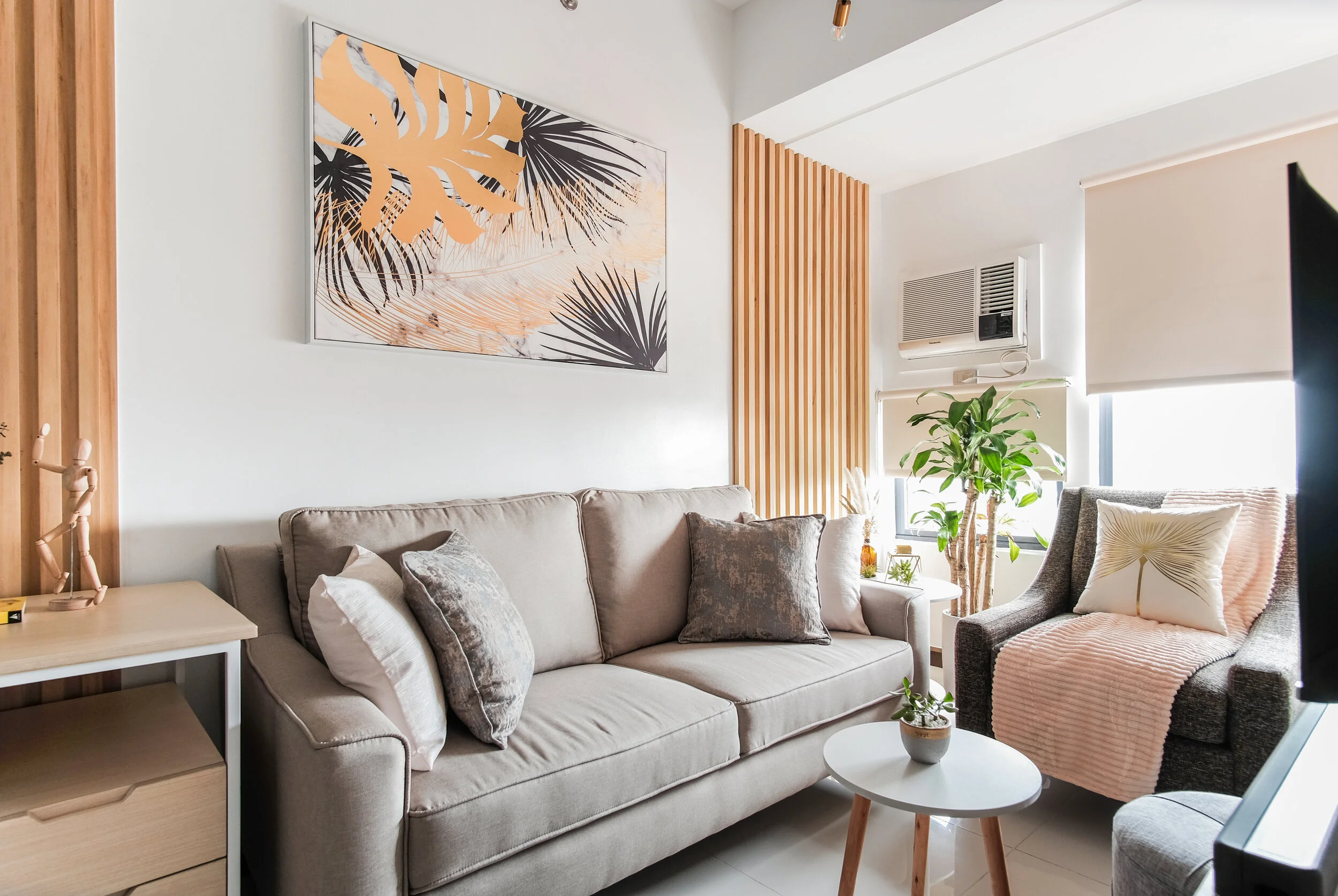 The living area was emphasized by the wood pvc wall claddings with a beautiful art piece at the center. Nude and warm colors were used in the furniture to highlight the plants and accessories. Behind the television is the main accent wall with a warm color and a hint of sheen wallpaper. Hints of gold in the art pieces and accessories give the area a luxe feel. The tv console is customized wherein it houses the ottoman and an additional storage. The sliding cabinet hides the tv wires, and at the same time, serves as an additional storage for movie snacks.