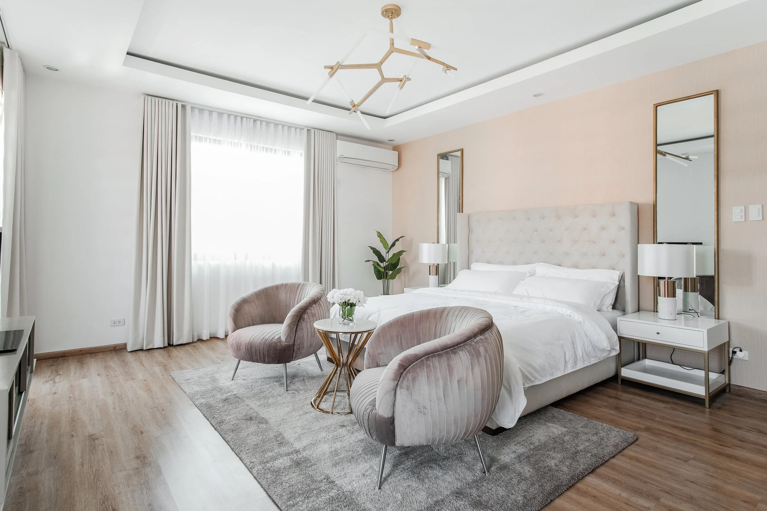 Warmth envelopes this classic contemporary Master Bedroom, and gold accents can be seen in the lighting fixture, lamps, and mirrors, giving the space a luxurious feel. The accent chairs in velvet suede, the tufted bed, and the shaggy carpet all add softness making it seem as if you’re inside a hotel room.
