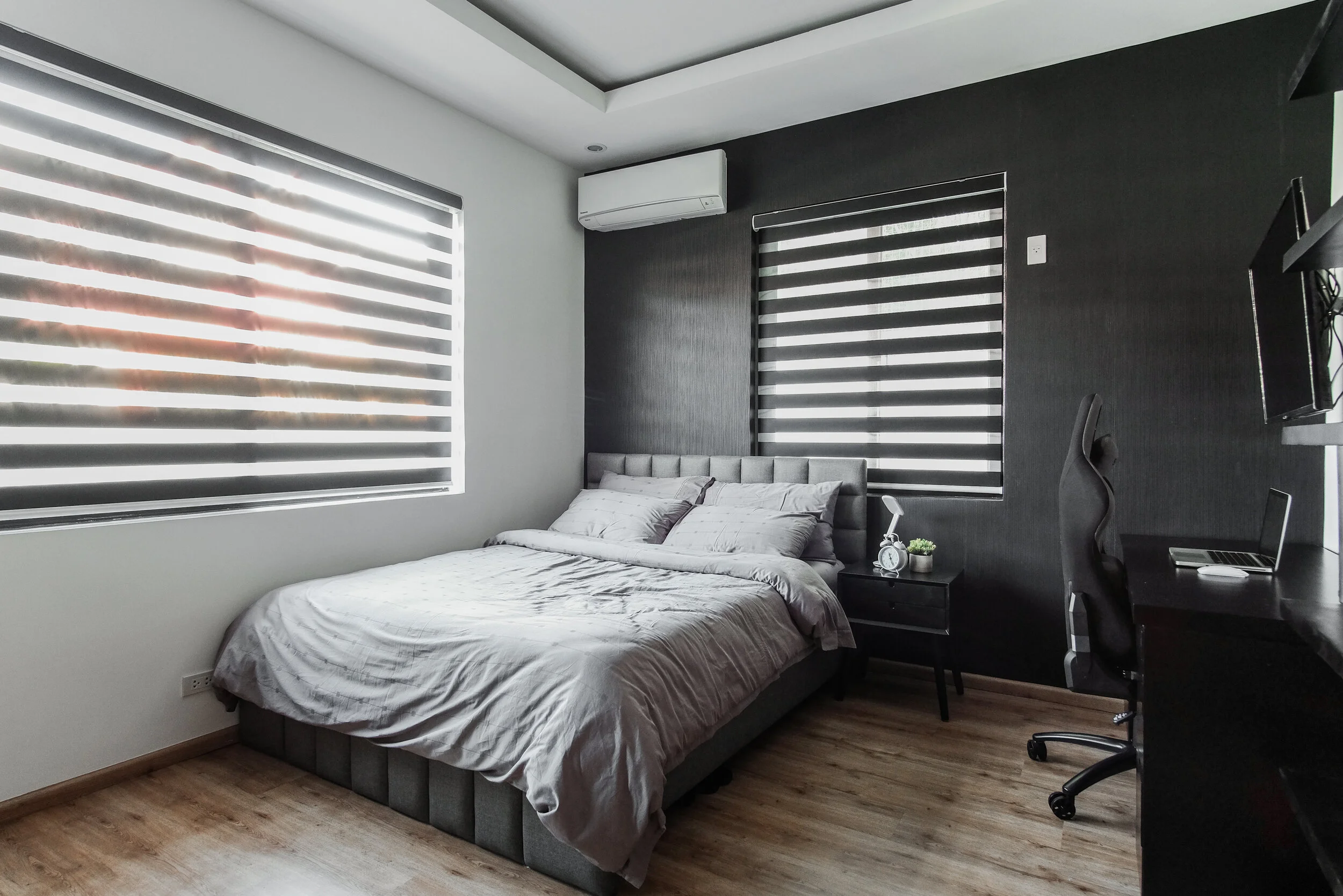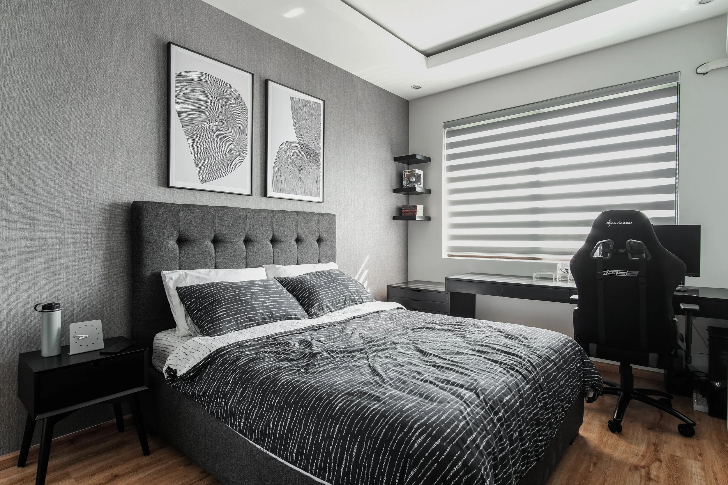 For this bedroom, our client wanted dark walls so we went with a black wallpaper with a subtle pattern, resulting in a simple and calming space.