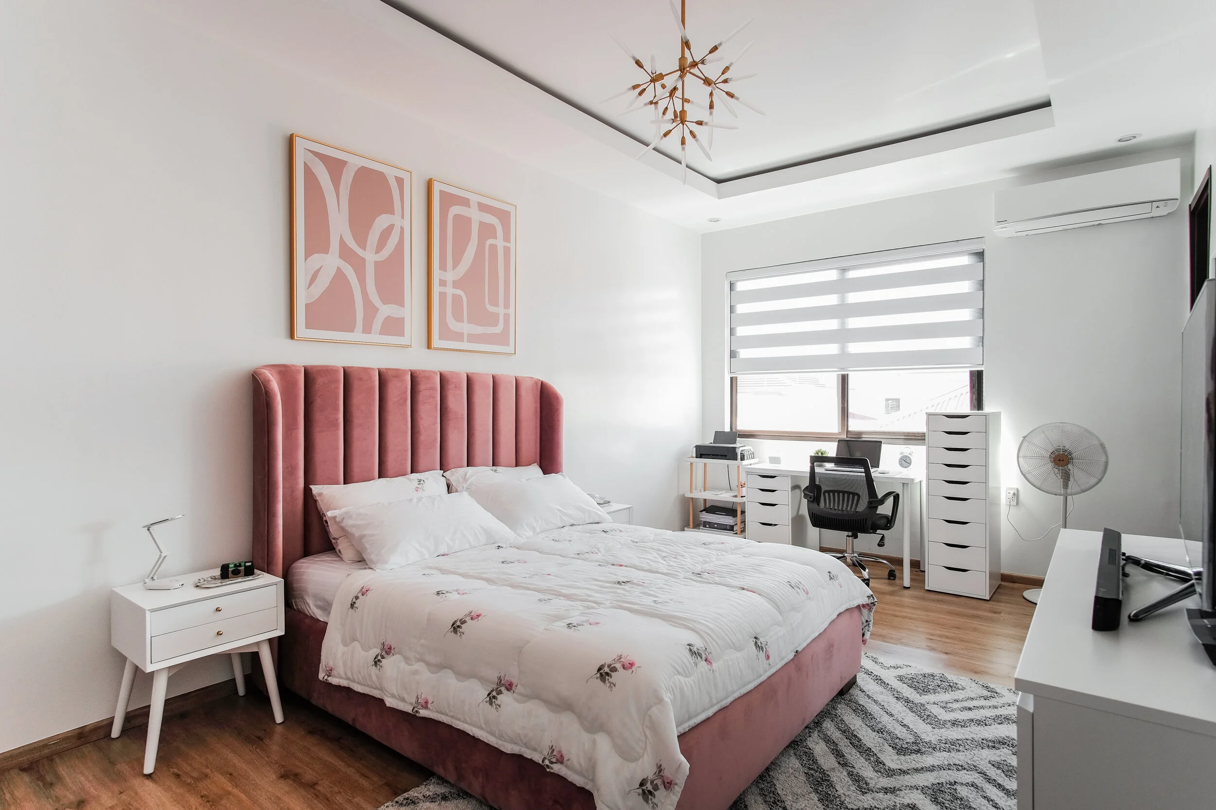 The pink bed becomes the focal point in this cheery and bright bedroom. We also gave the space a few touches of gold, giving it a modern and classy feel.