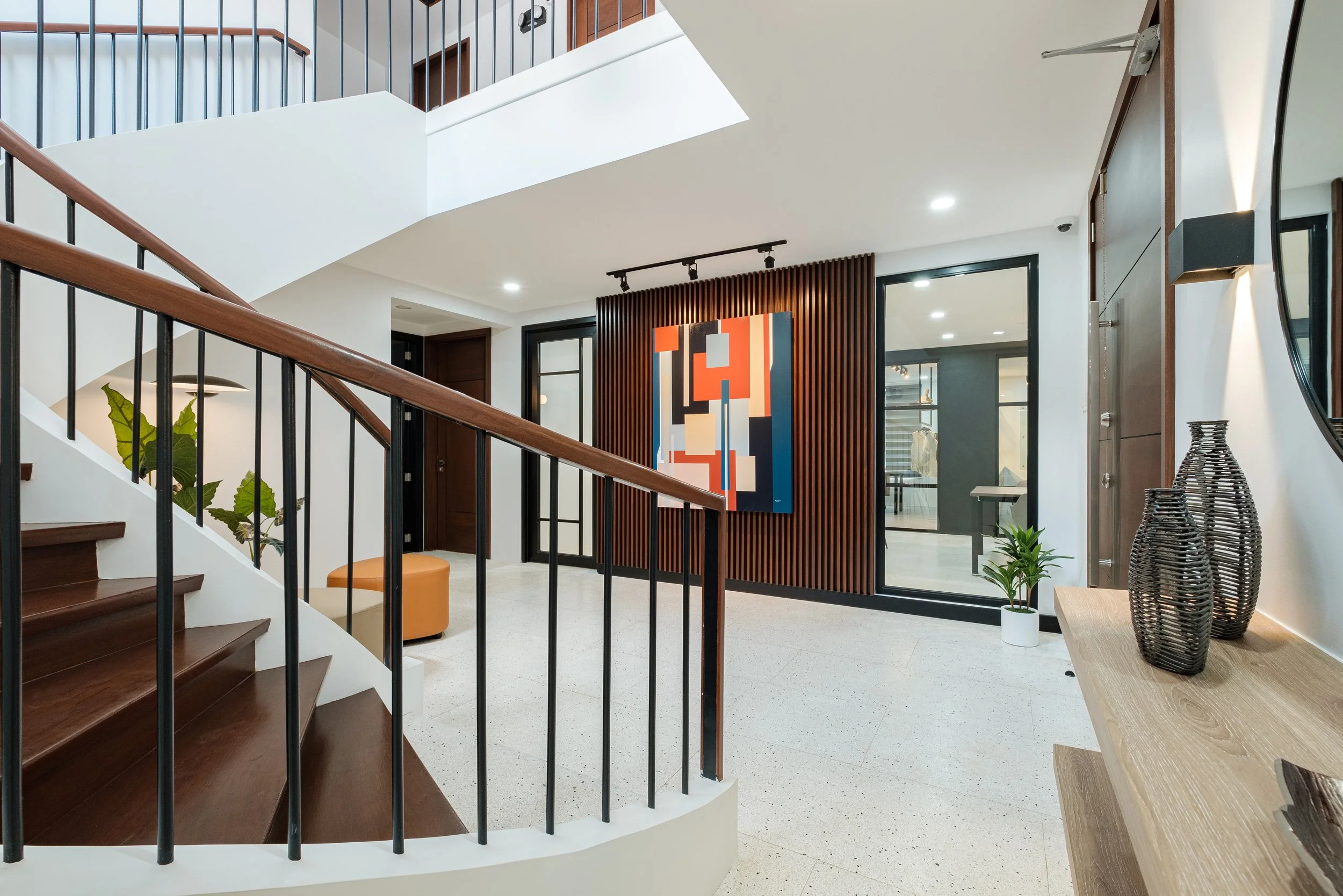 Welcoming the space is a new feature wall with wood slats and a commissioned painting entitled “Synergy” which encompasses the theme of the space: co-existence of opposites like order and chaos, old and new, and a prominence of lines and shapes.