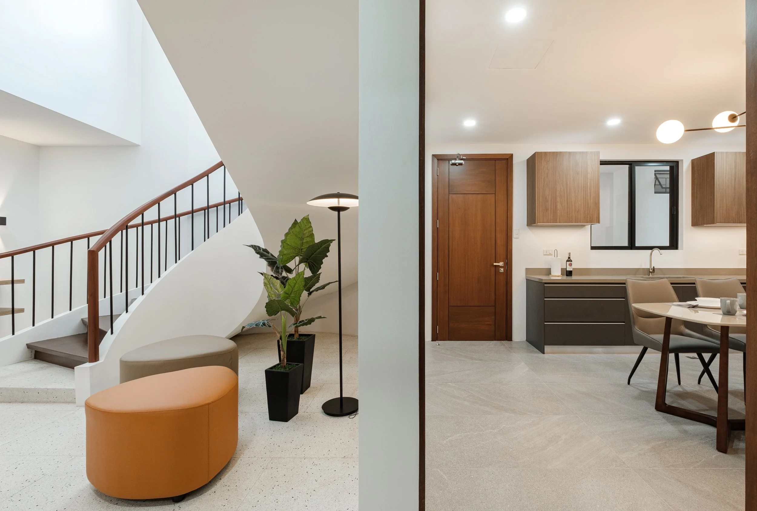 The original terrazzo flooring, resembling the stone grounds of a Zen garden, inspired us to create a little lounge area just below the staircase. We tried to bring a little of the outdoors into the space by adding pebble-shaped ottomans, indoor plants, and a floor lamp that glows like a garden lantern.